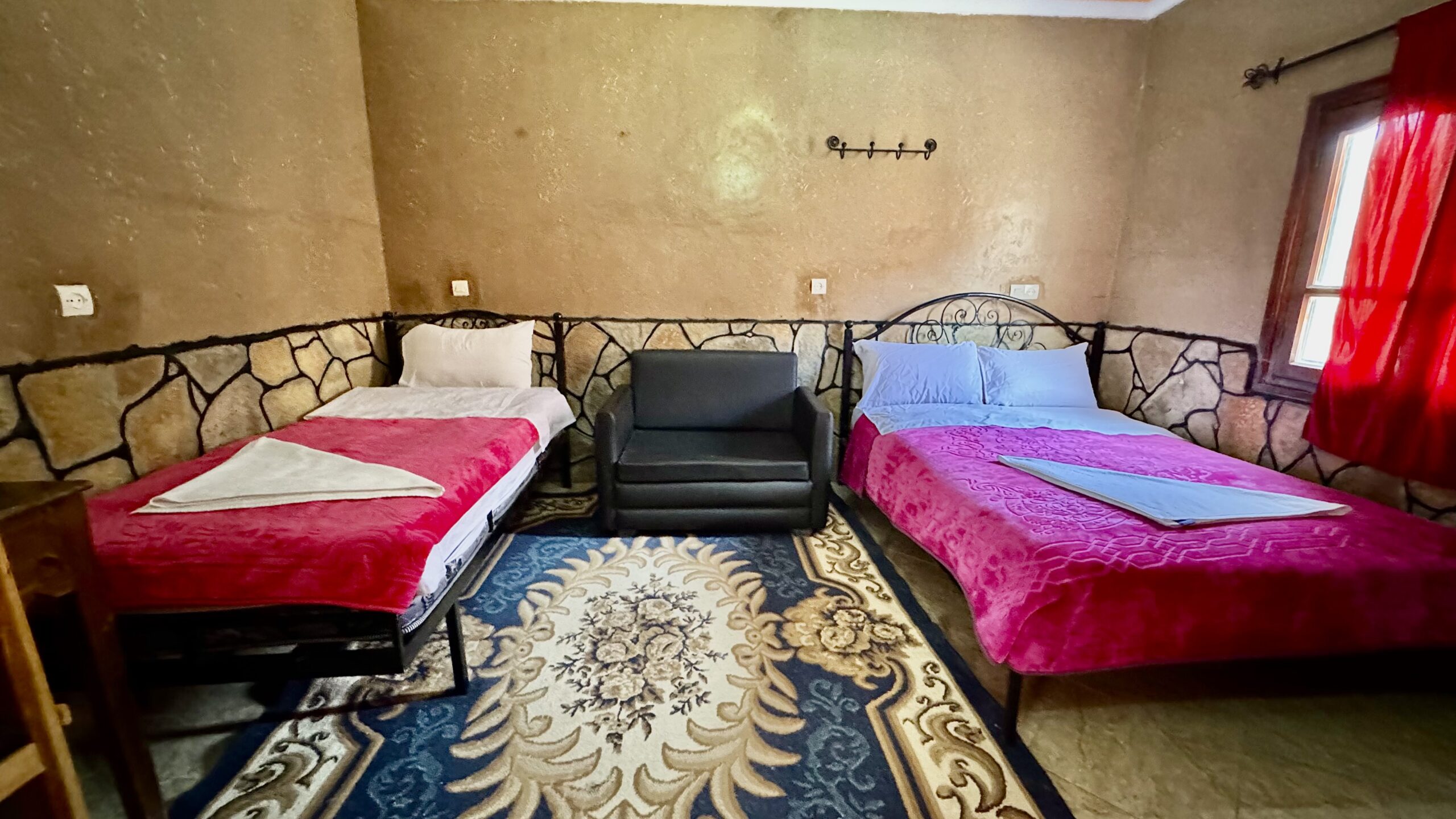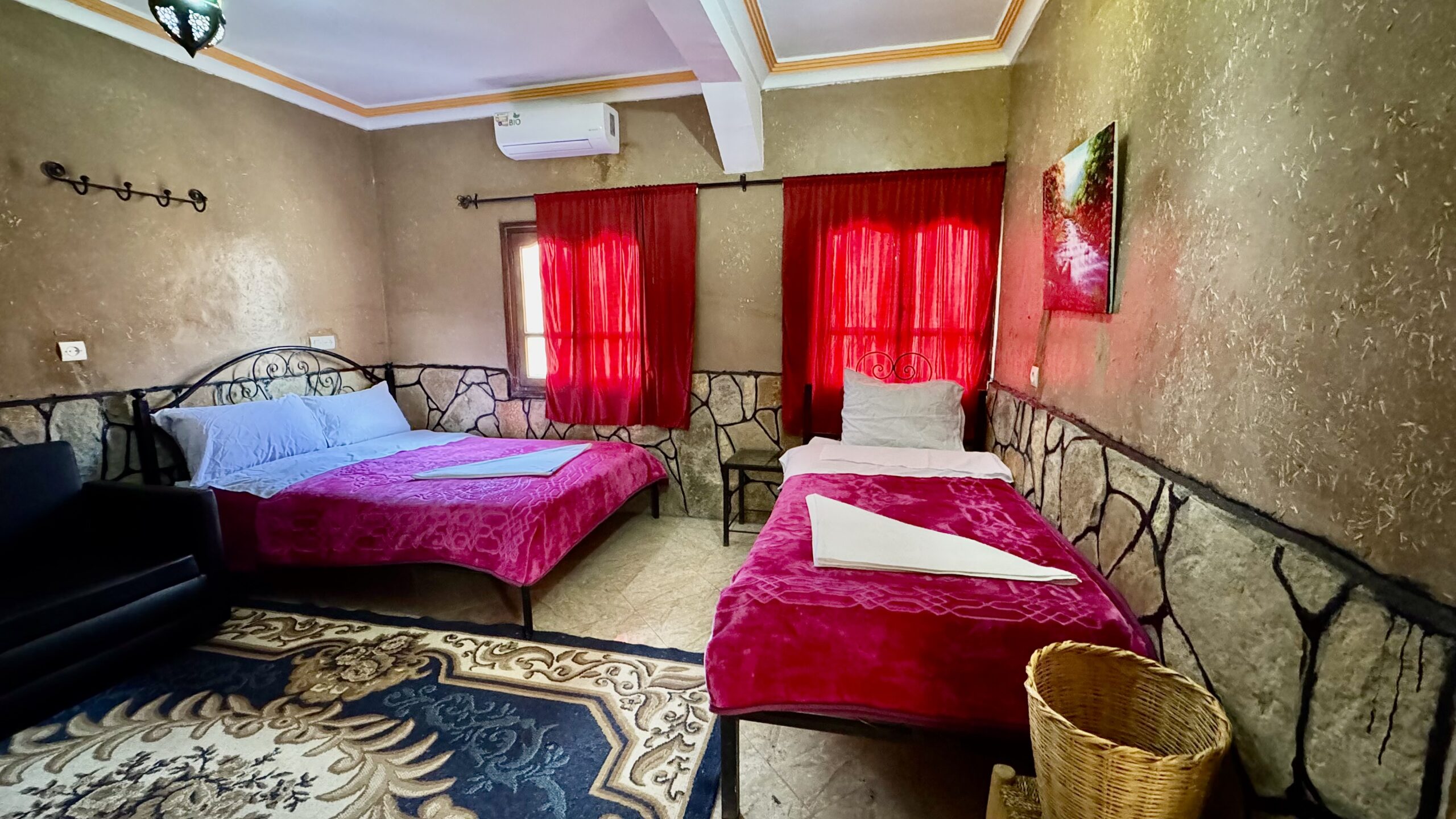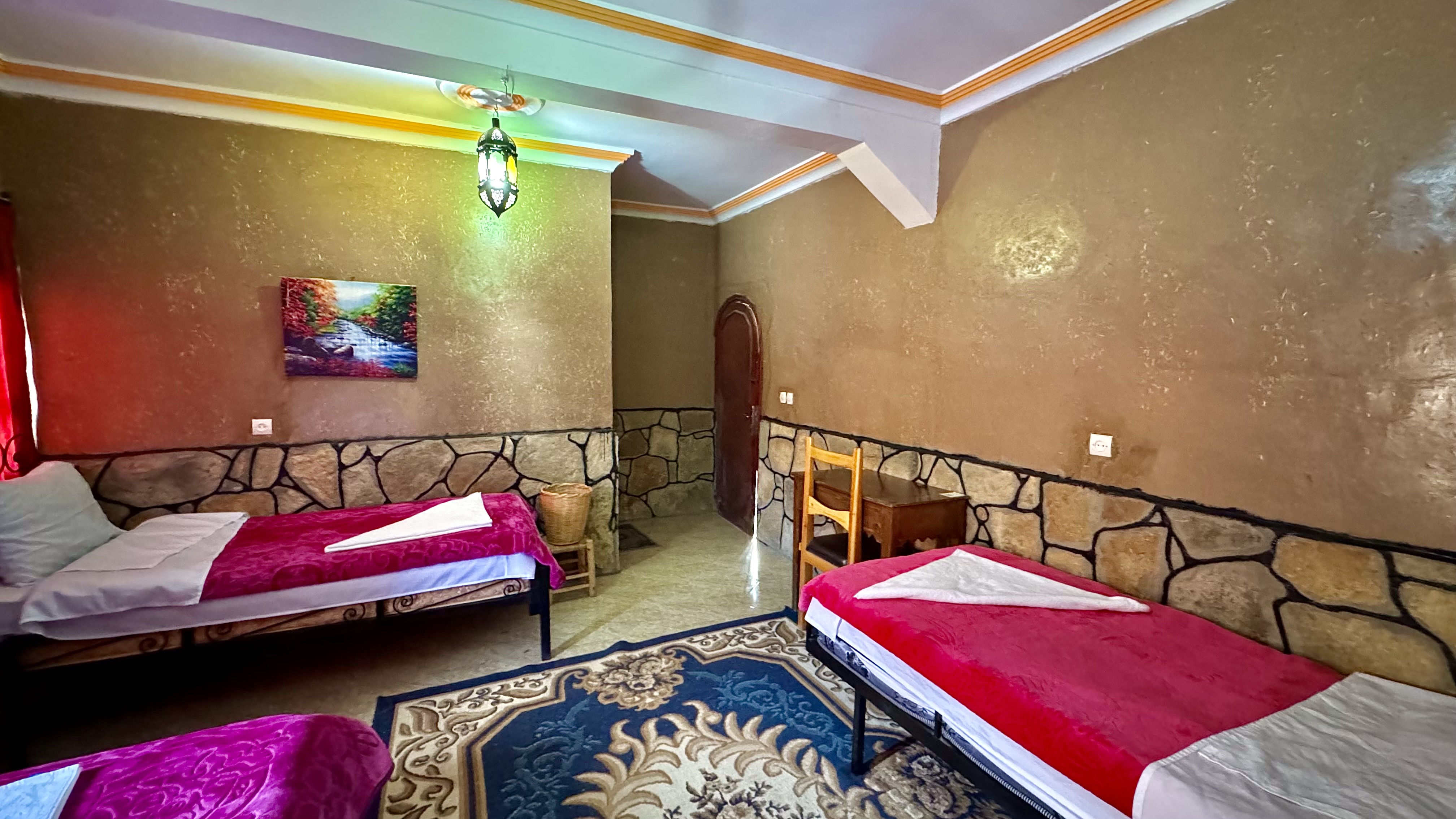 La chambre triple du Riad Les Jardins des Gorges de Todgha est idéale pour les familles ou les petits groupes. Spacieuse et confortable, elle est aménagée dans un style marocain authentique et offre un cadre calme et chaleureux pour un séjour agréable.